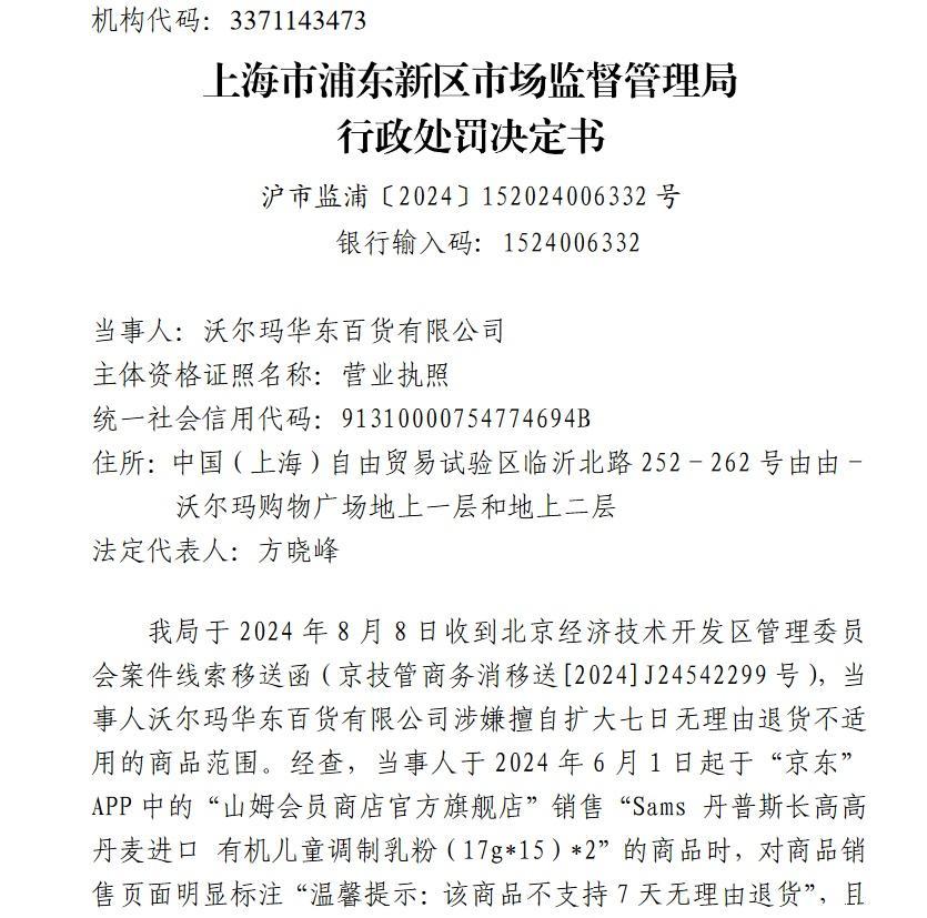 凭证行政措置决定书,沃尔玛华东百货有限公司于2024年6月1日起于京东山姆会员商店官方旗舰店销售“Sam's 丹普斯长高高丹麦入口 有机儿童调制乳粉(17g*15)*2”,对商品销售页面显著标注“该商品不支撑7天谬妄由退货”,且在后台缔造商品属性时缔造为“售后战术:不支撑7天谬妄由退货”。